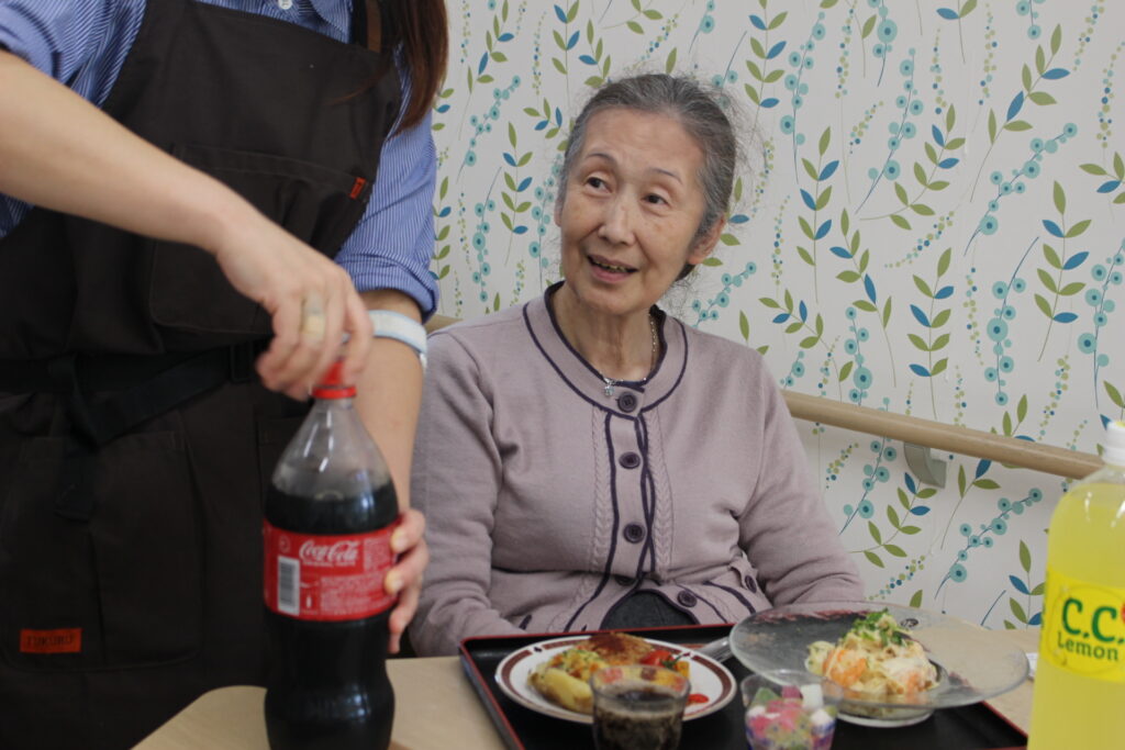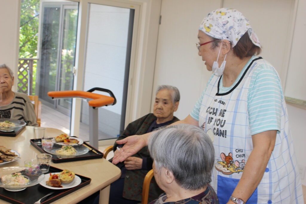 この日のために、つぐみユニットでも、余った食材費でお肉を用意し外で焼き鳥を施設長と副主任で暑い中焼いてくださいました。