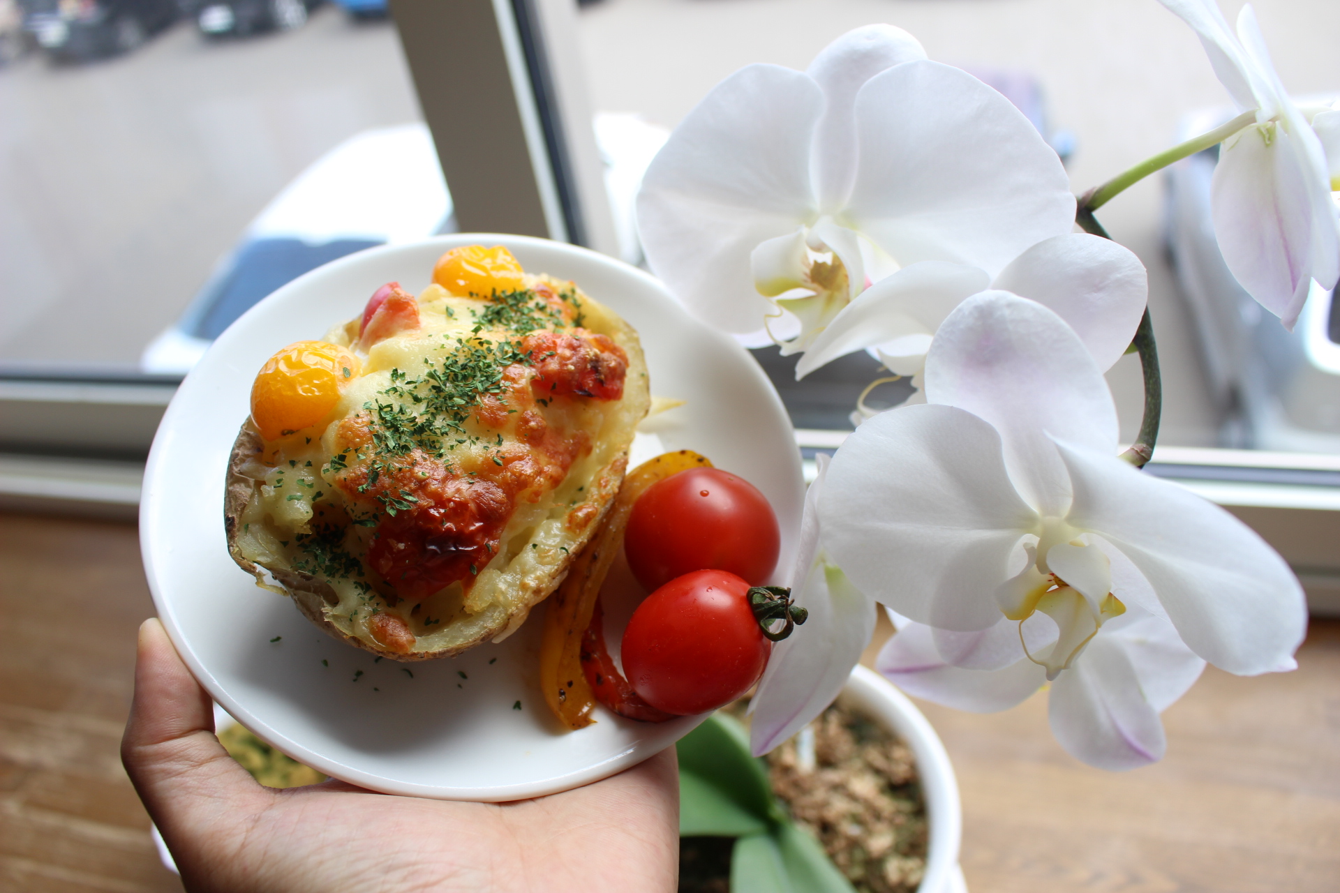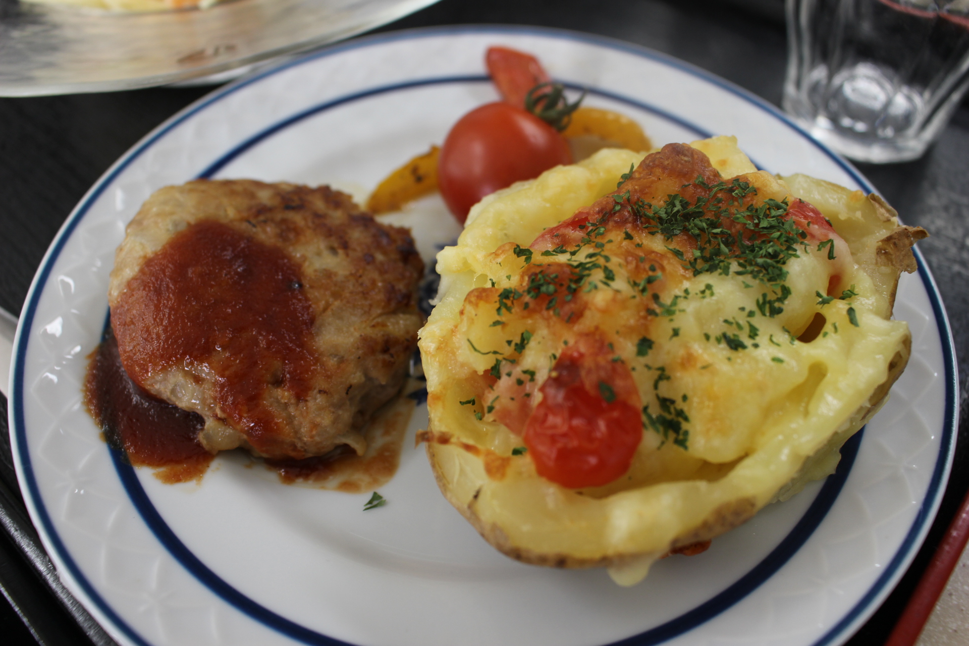 今回のメニューは、ハンバーグにジャガイモグラタンす。ジャガイモは、一度茹でてから半分に切って中身をいったん取り出し味付けをして又、ジャガイモに盛り付けをします。そして、オーブンで焼き目を付けました。