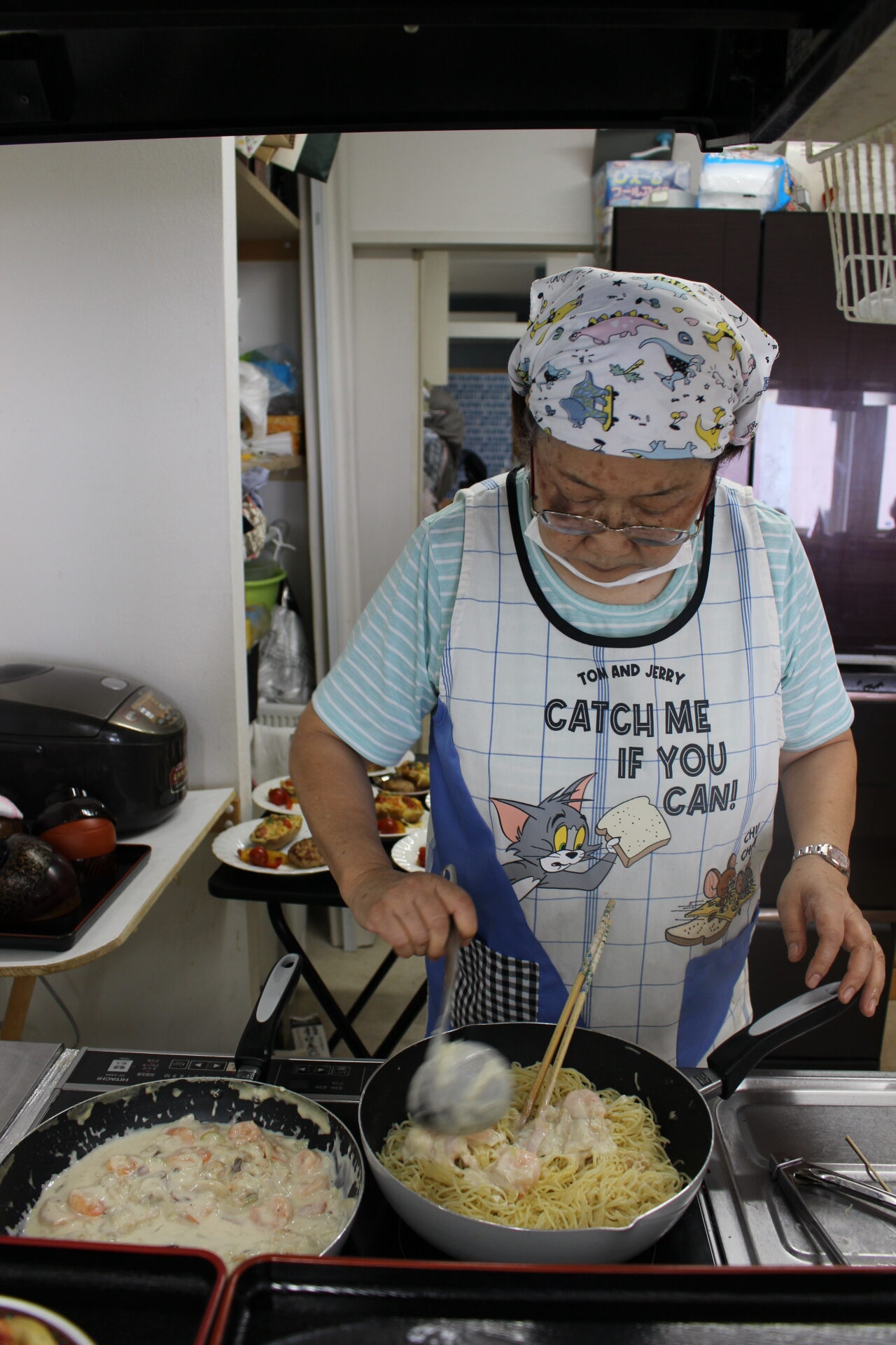 朝早くから主任と早番で、一生懸命ランチを作っています。前々から事前に何を作るかいっぱい考えました。
