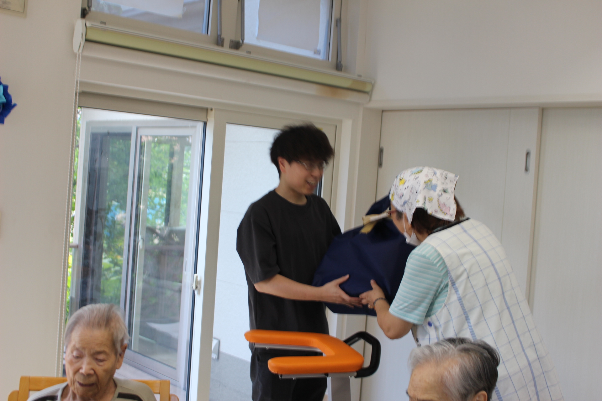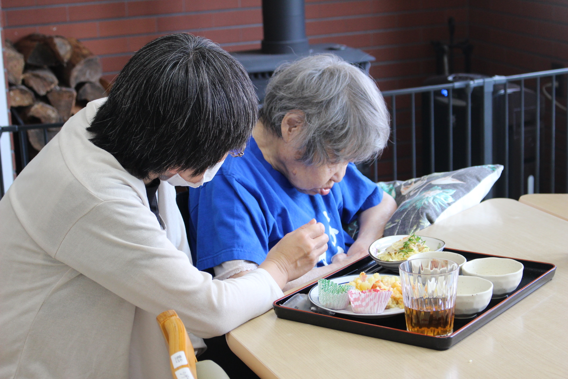 この日のために、つぐみユニットでも、余った食材費でお肉を用意し外で焼き鳥を施設長と副主任で暑い中焼いてくださいました。