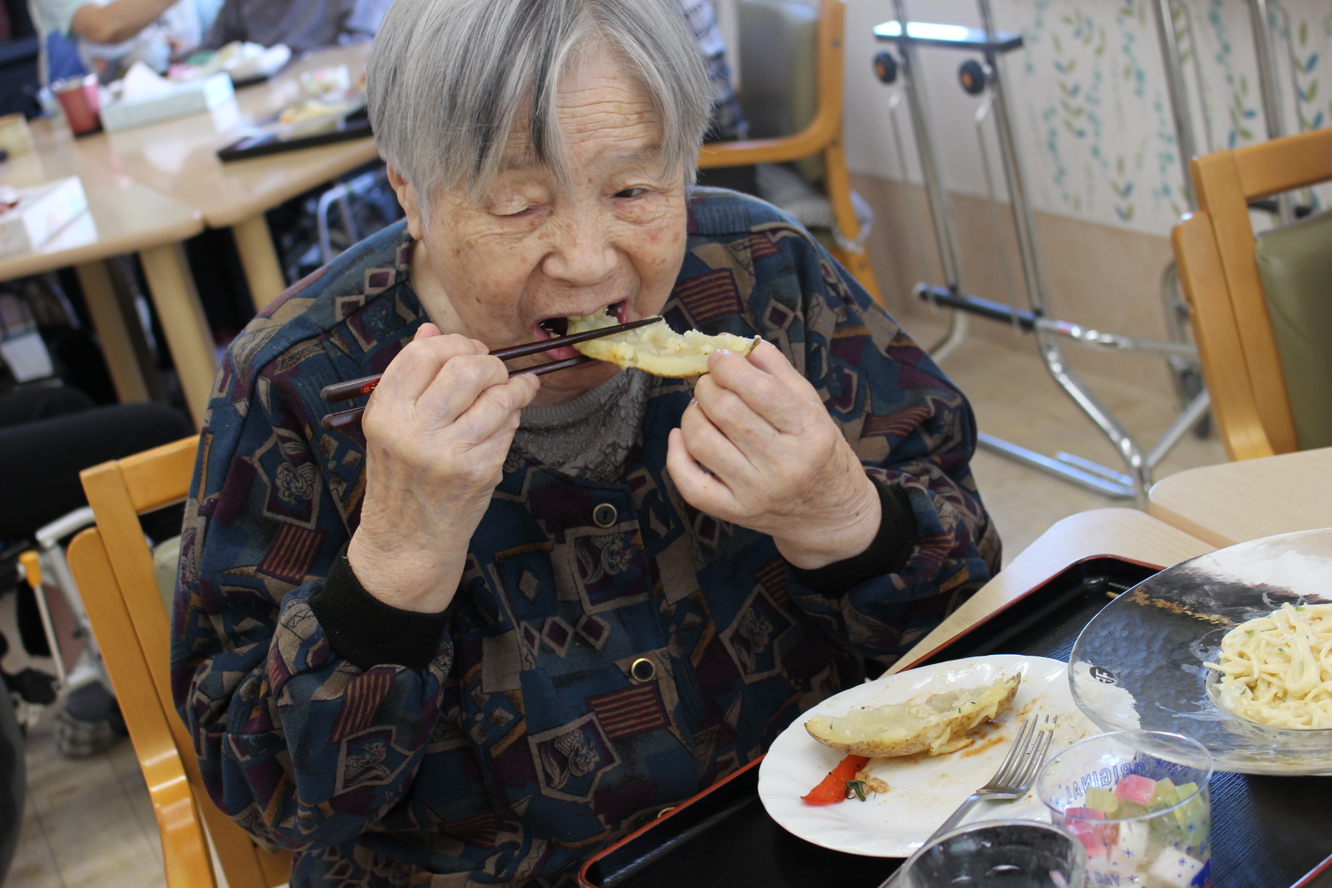 ジャガイモの皮まで食べれますよ!!!と職員が説明すると、驚かれていました。そしたら、食べてみるよ!と言われかぶりつかれます。