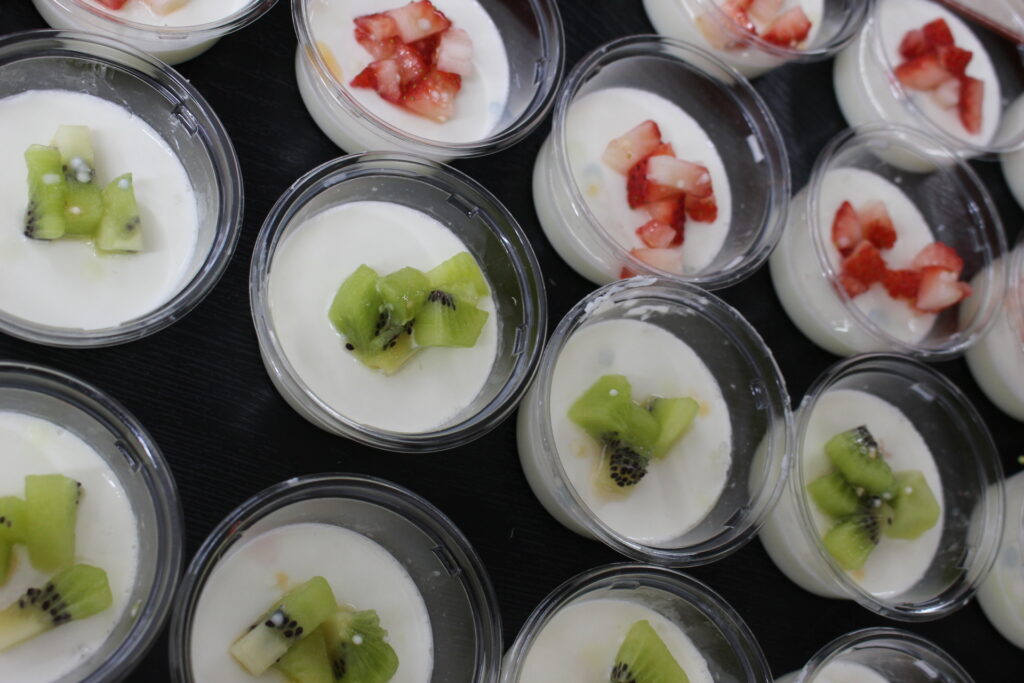 こちらは、牛乳寒天に果物を乗せました。イチゴが先に完売💦