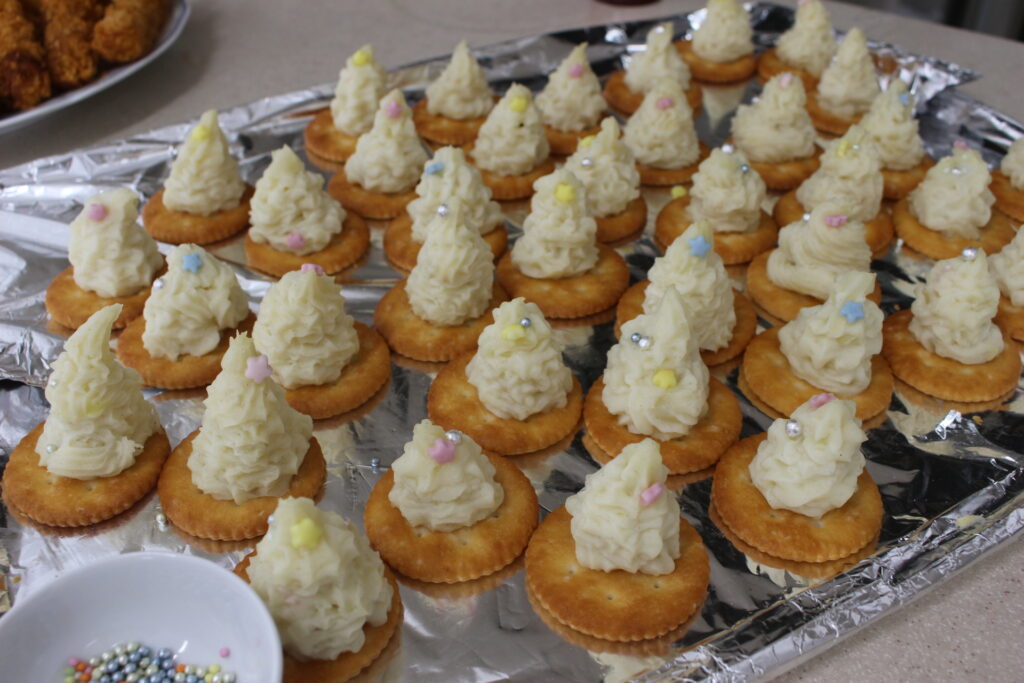 職員総出で、お料理開始です!!カップに、海鮮ちらし寿司を盛って行きます。錦糸卵も頑張って作りました。