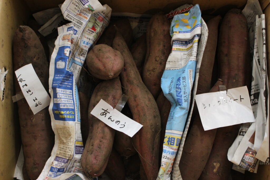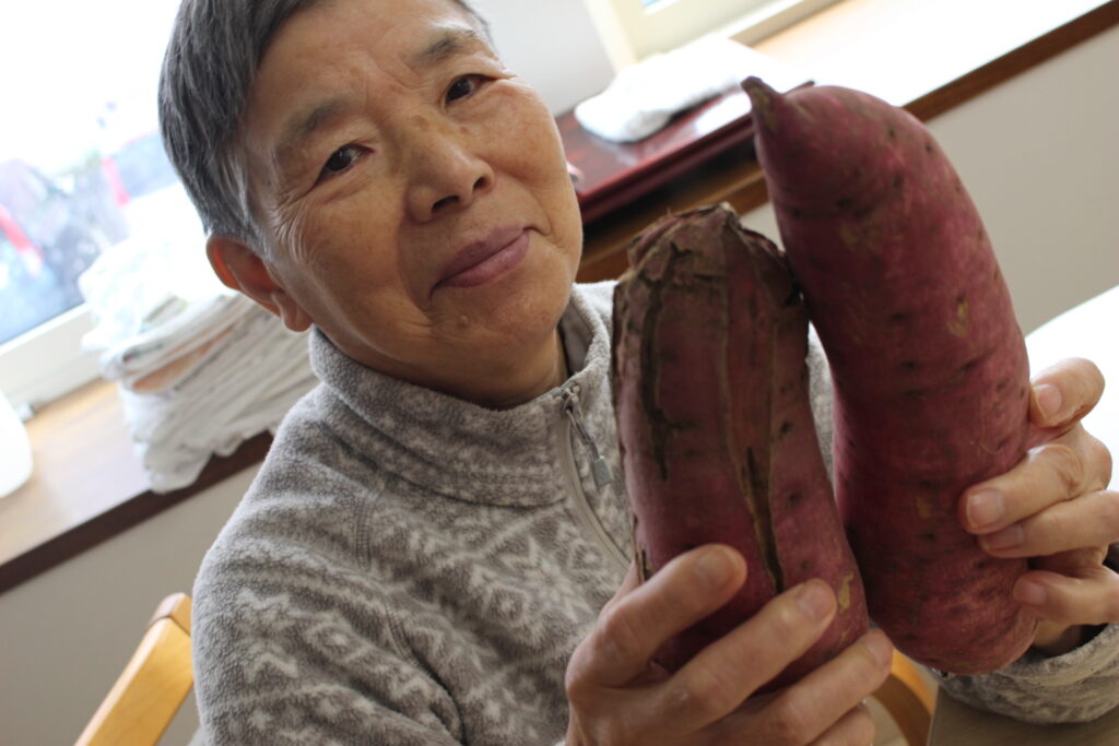 そんなある日のこと、つぐみユニットのご家族様より沢山のサツマイモを頂きました。とても立派で種類も分かれていました。紅はるか、あんのう、シルクスイートです。食べ比べが楽しみです。