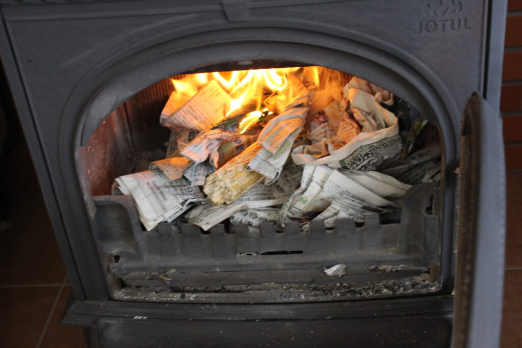 薪の中に丸めた新聞紙を入れ火を入れます。空気の流れを上手く作ることが出来れば成功です。出来ました、出来ました、沢山燃え上がってきました。暖かい♪