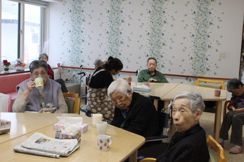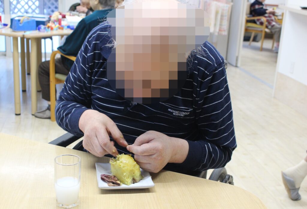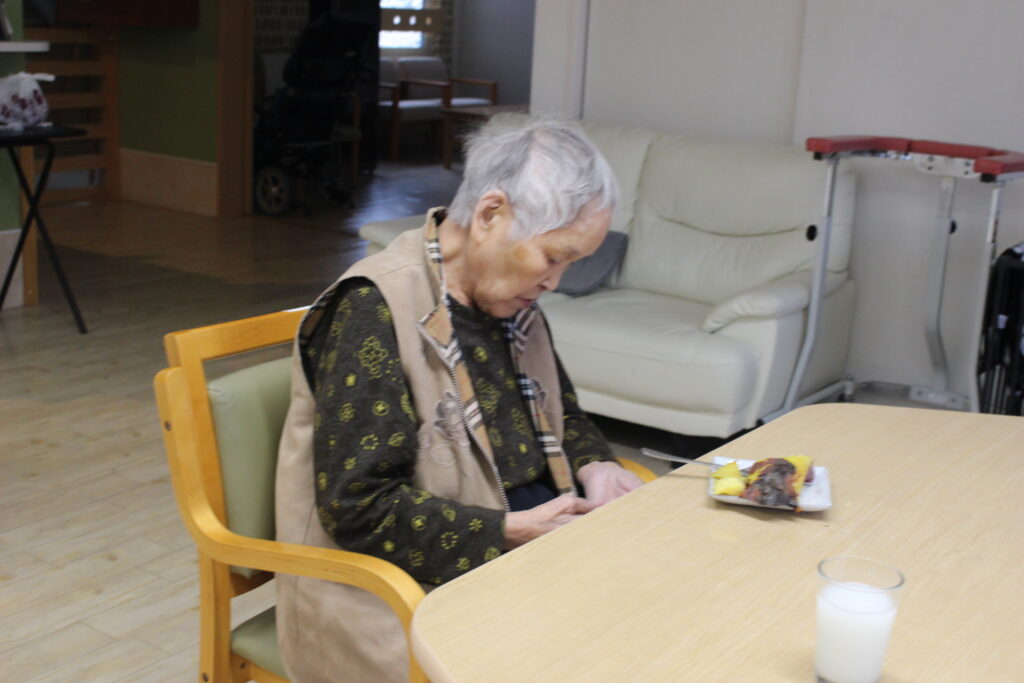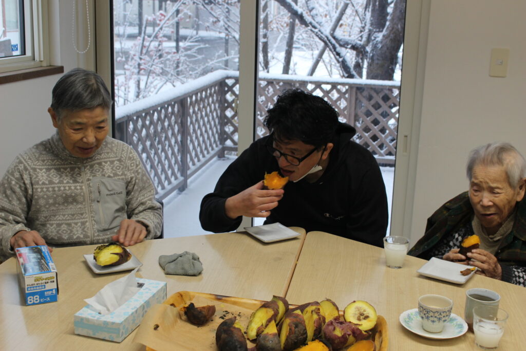 施設長と一緒に皆さんお芋を堪能されます。ふ~ふ~しながら召し上がりました。