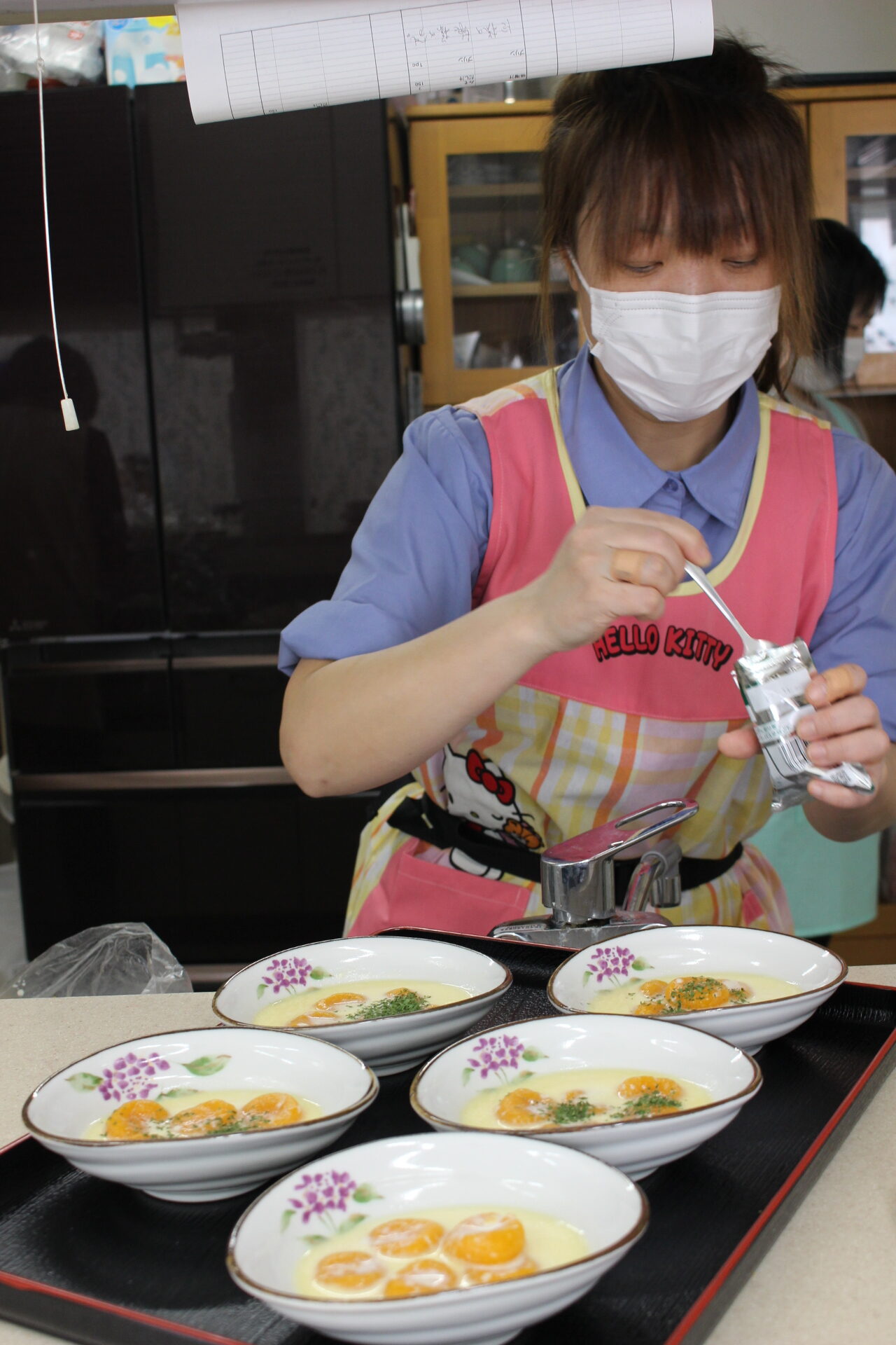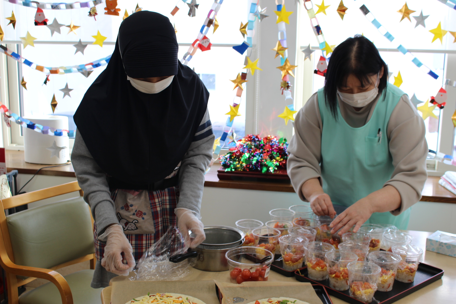 職員総出で、お料理開始です!!カップに、海鮮ちらし寿司を盛って行きます。錦糸卵も頑張って作りました。