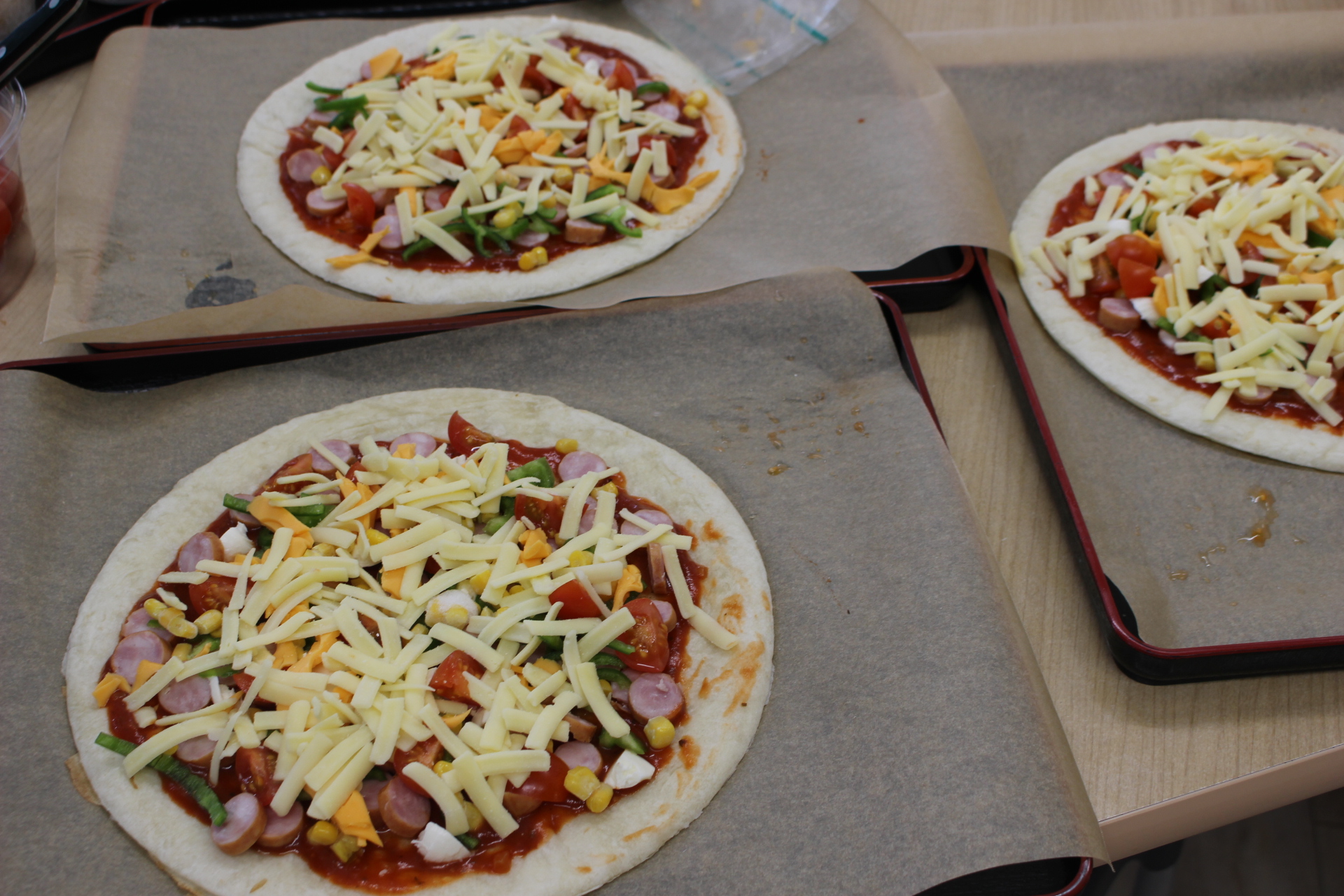 具が、いっぱいのピザです。余った食材もどんどんのせていきました。これは、出来立てを食べてもらいましょうとぎりぎりまで焼くのを我慢しました。