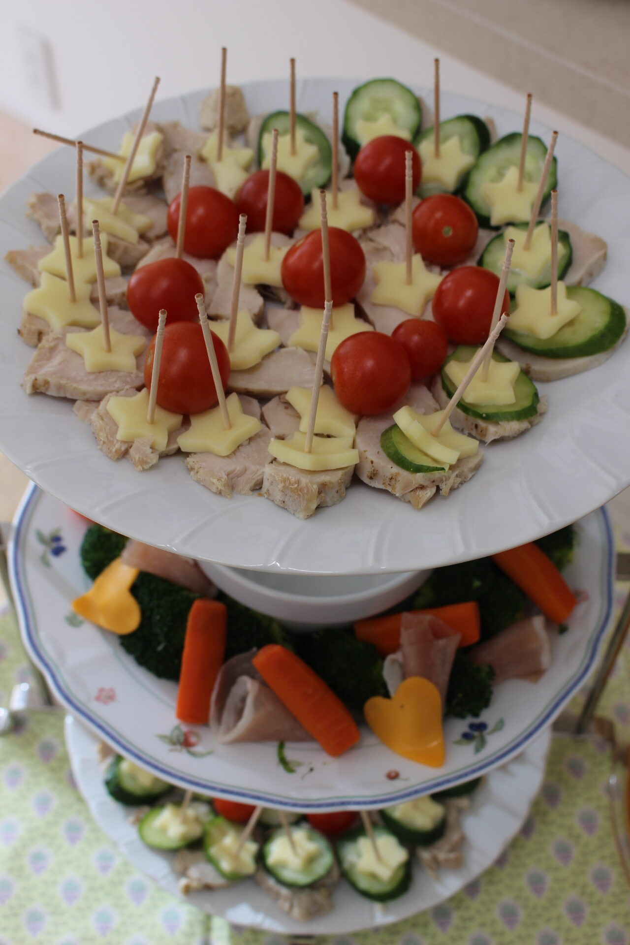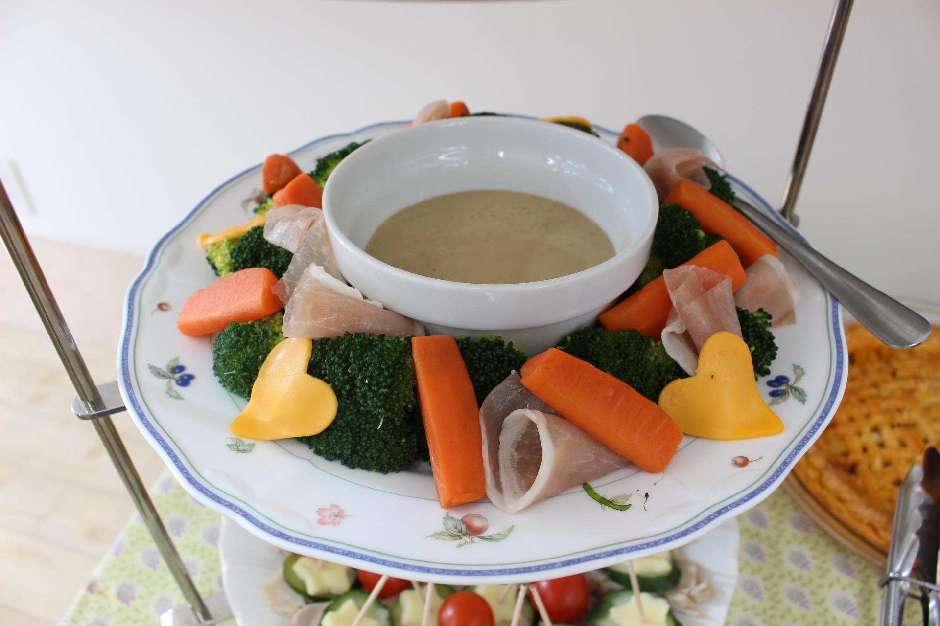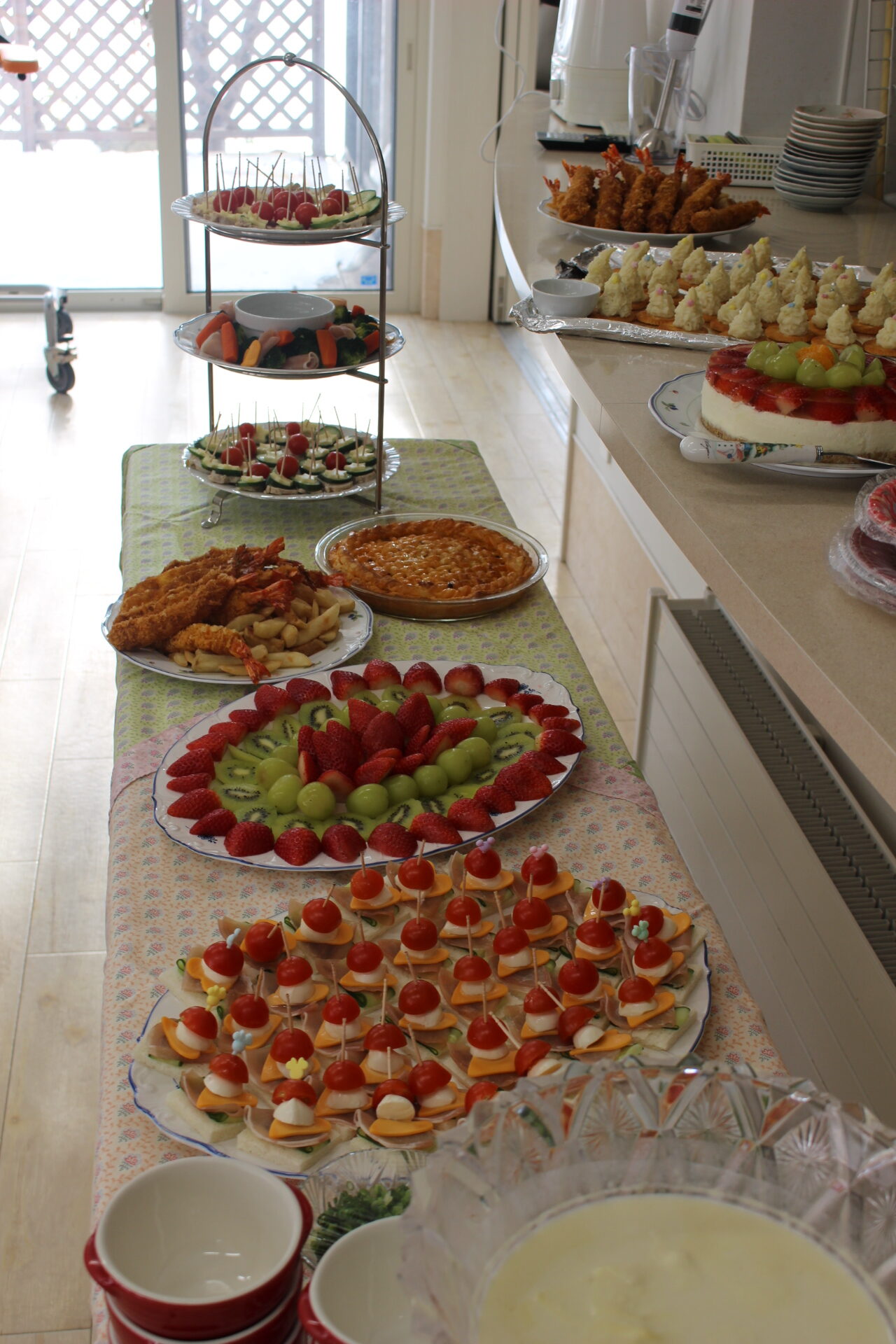 サラダをお洒落に盛り付けて、可愛くハートや星のチーズをのせちゃいます。一番上のピンチョスは施設長お手製です。