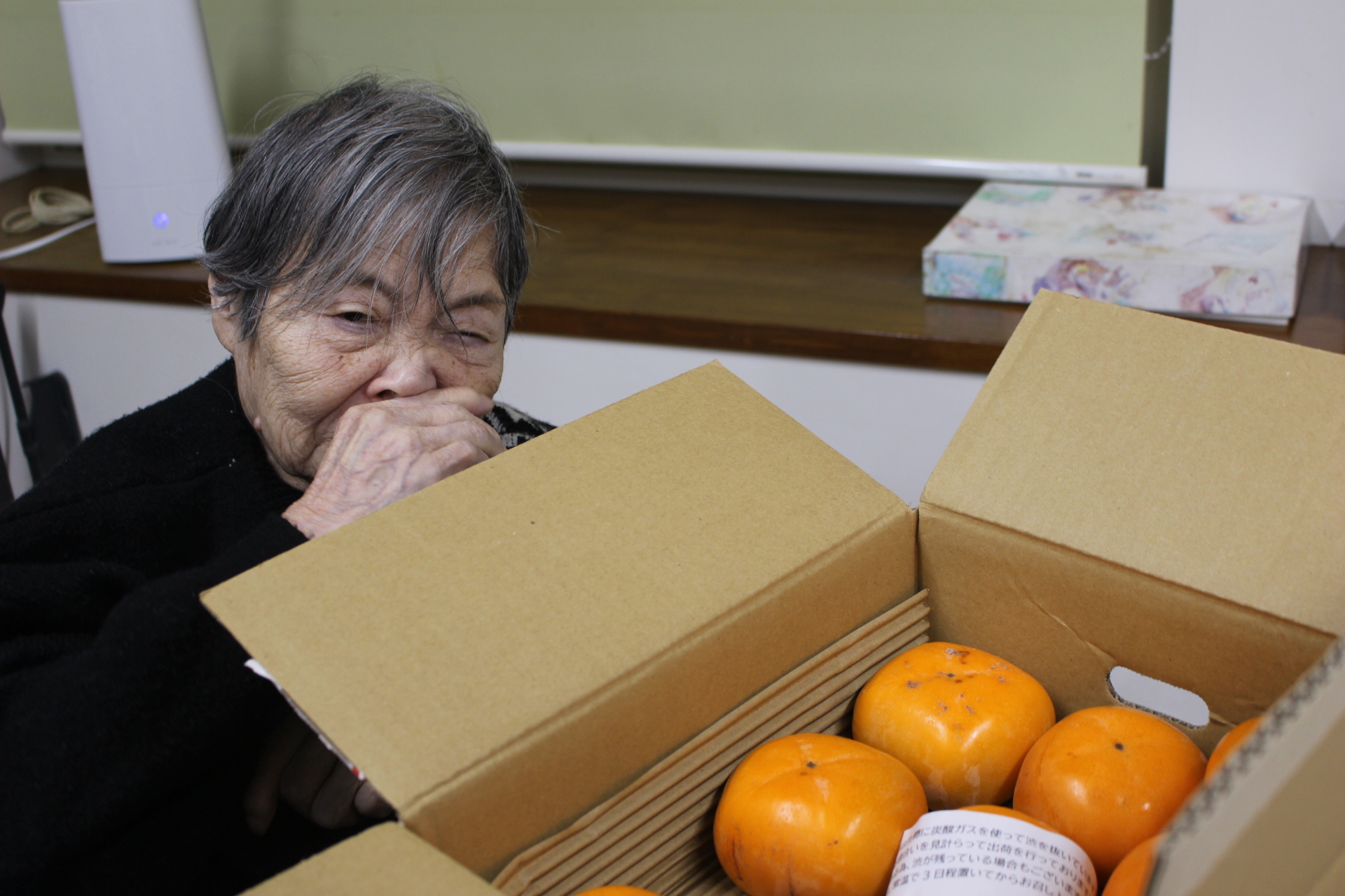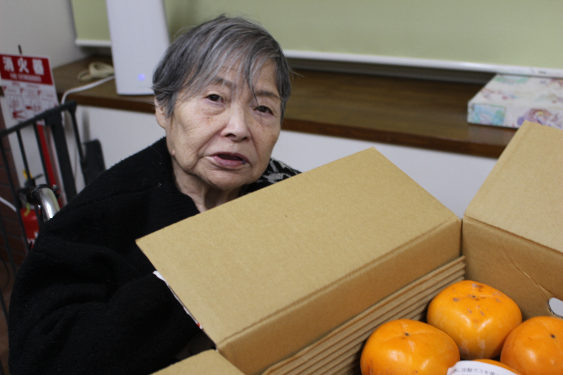 嬉しいね♪と、笑顔でした。柿を見て眠気が吹っ飛んだ様子です。これから、まだまだ寒くなりますが冬に負けず元気に過ごしていきたいです。今年もあとわずかですが、よろしくお願いします。(#^.^#)