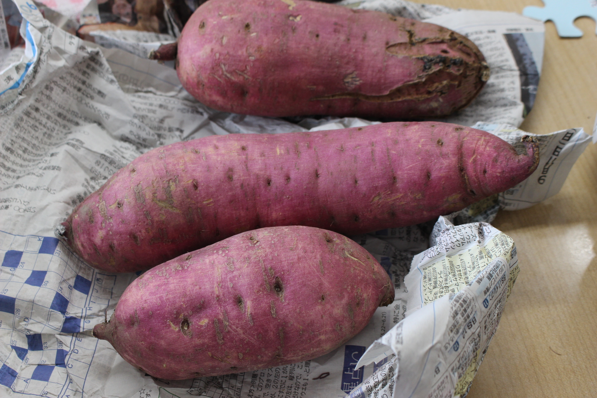 そんなある日のこと、つぐみユニットのご家族様より沢山のサツマイモを頂きました。とても立派で種類も分かれていました。紅はるか、あんのう、シルクスイートです。食べ比べが楽しみです。