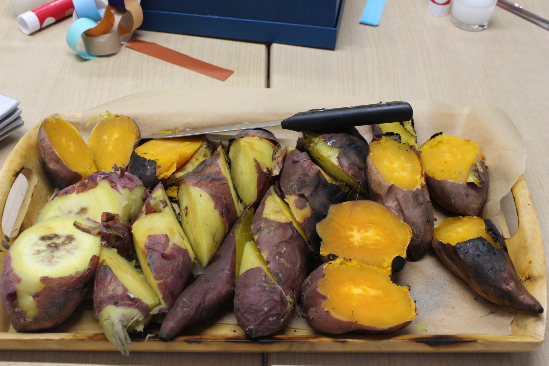 熱々なうちに食べやすく切りました。お芋の種類によって色が違います。