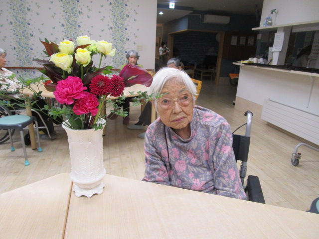 毎回届いた際は職員と共に、添付されたお花の名前を見ながら、「とっても綺麗ね。」とお話ししてくださいます。他の入居者様も「私はこのお花が好きよ。」などと、皆さんで楽しまれています。