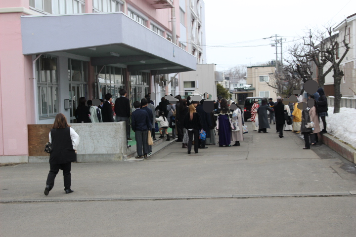 小学校の玄関前には、ざわざわと人がどんどん集まってきていました。