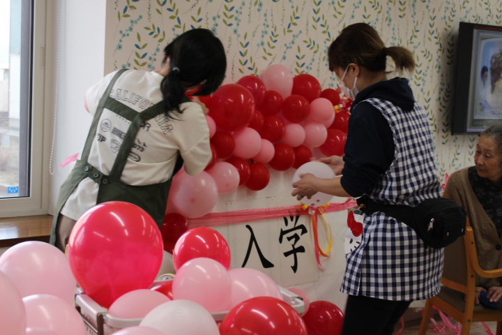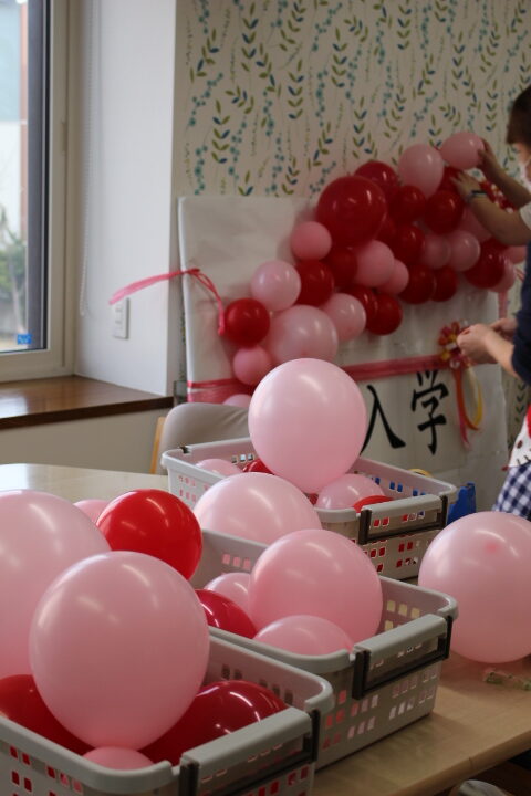 いよいよ入学式の時期が近ずいてきました。入学式に向けて職員が下準備を始めていきます。卒業式では、淡いピンク紫を使用しましたが、入学式では明るい赤やピンクの風船を使用しました。イチゴの風船も加わり素敵な完成品になると良いな~💦と職員頑張っていました。