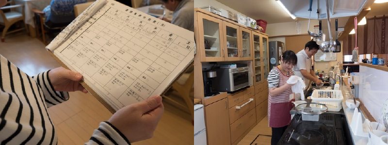 左)1日の仕事の割り振りをチェックしてからスタート 右)昼食の後の食器を施設長と情報交換しながら洗う