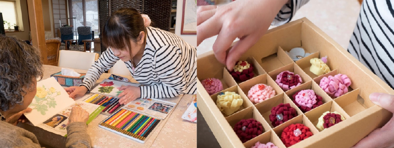 左)利用者さまと色についてお話 右)レクリエーションでつくるものはスタッフのアイディアから生まれる