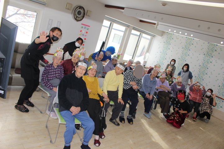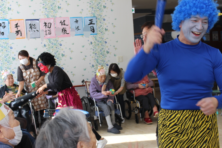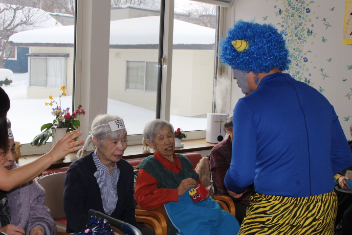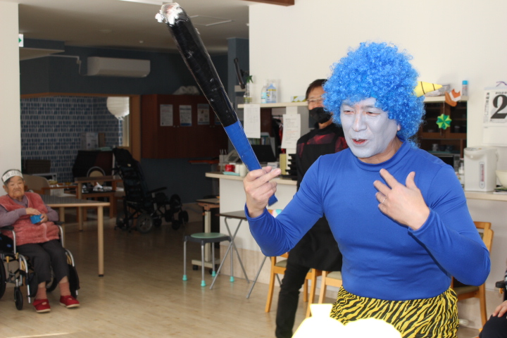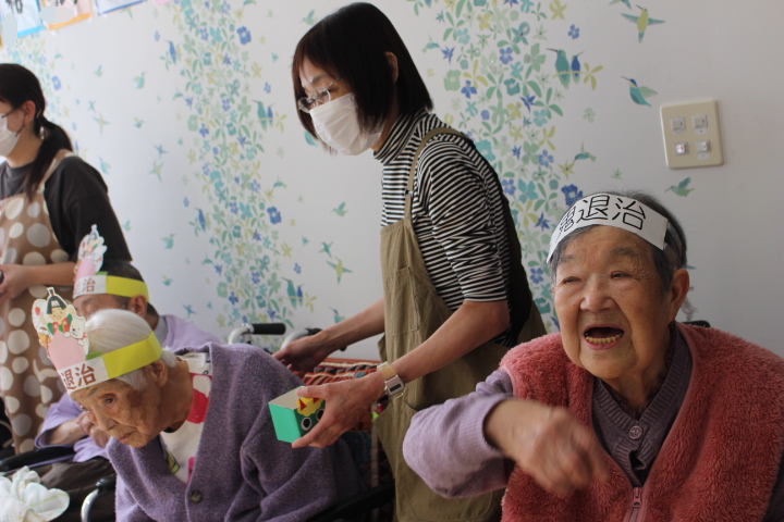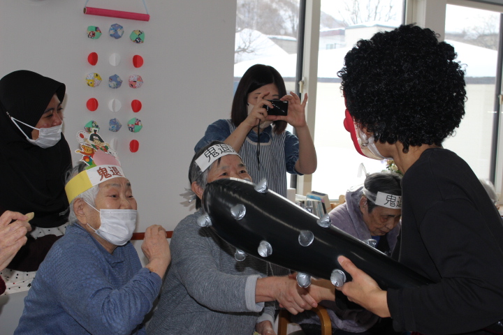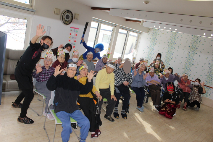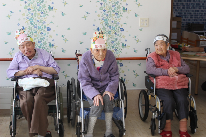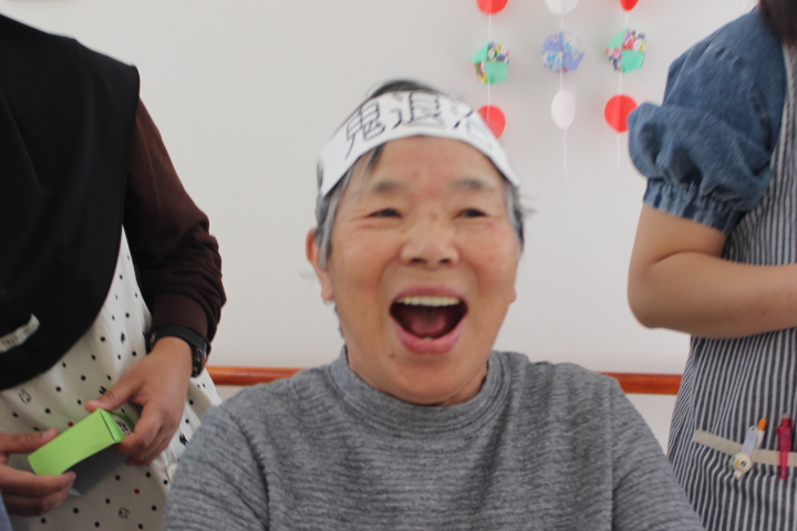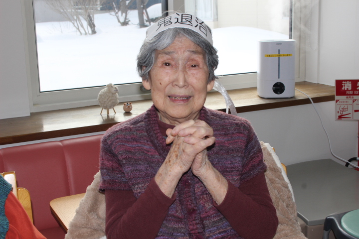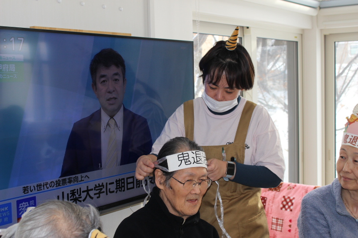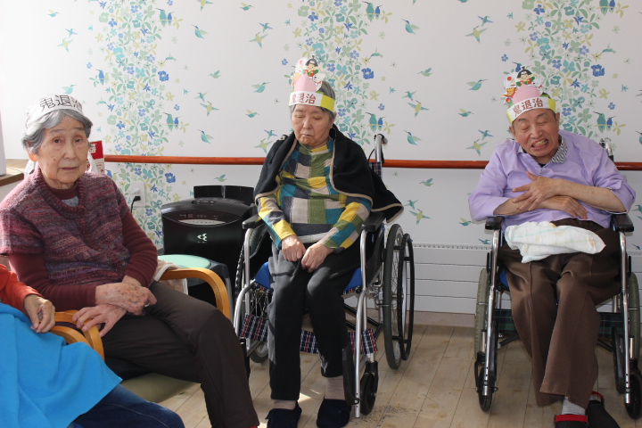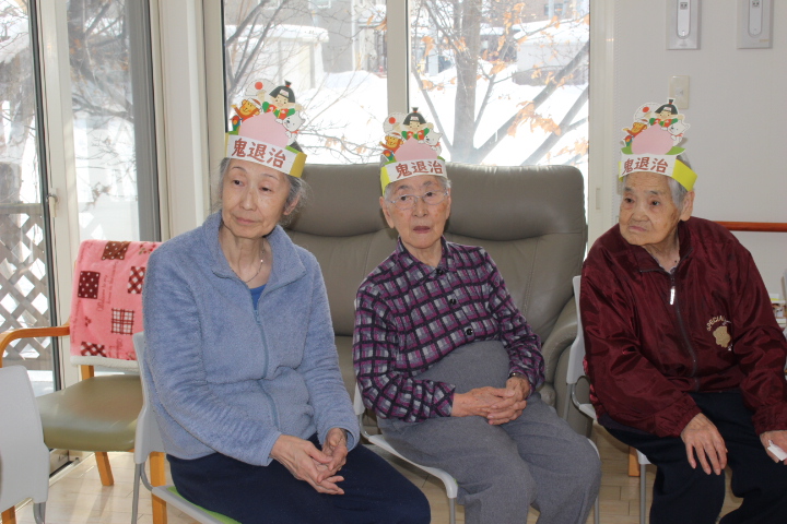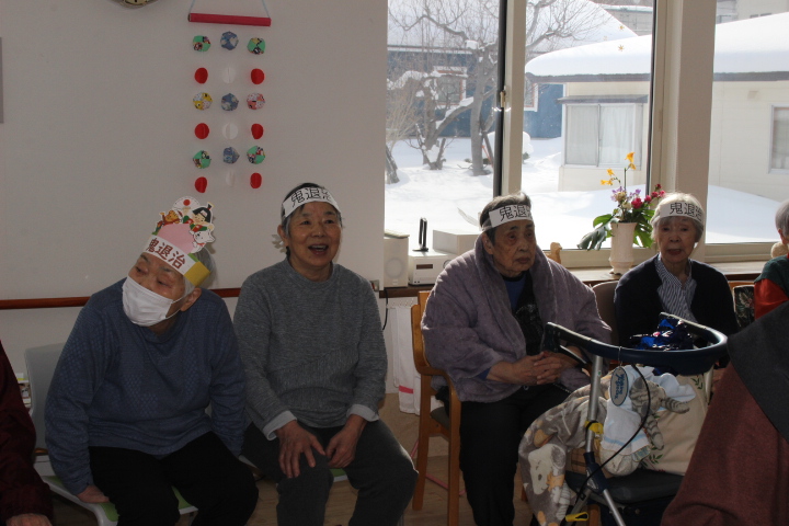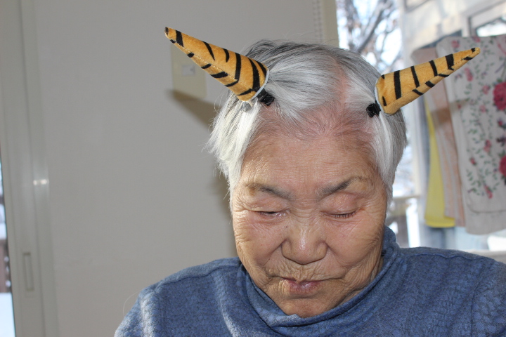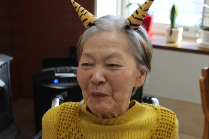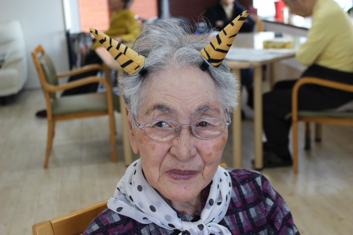 2月2日藤野の杜では節分行事を行いました。朝から皆さん鬼の角を頭につけて笑顔で過ごされていました。