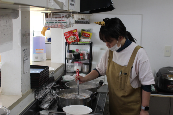 キッチンでは、角を付けた職員が、けんちん汁を作っています。あく抜きをしていました。