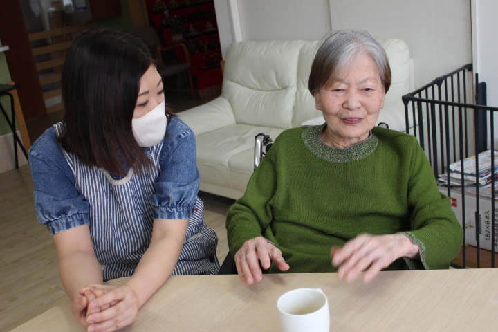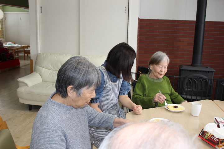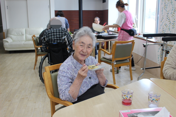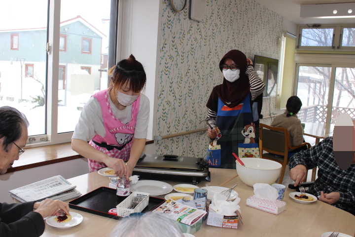 ホール内に甘い香りが広がり、始まる前から皆様ワクワクしていた様子です。昔は、子供たちに良く作ったもんだよ~と楽しそうに職員にお話をされていました。ホットプレートで、焼肉もしたんだよ!と言われていました。