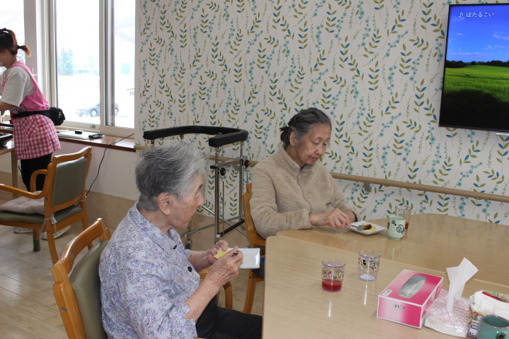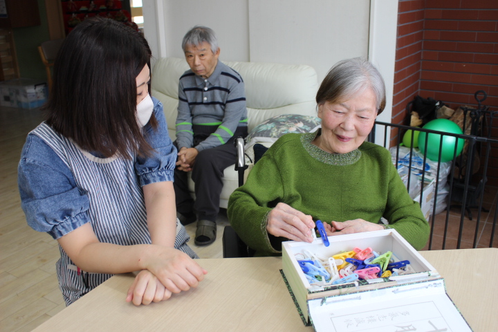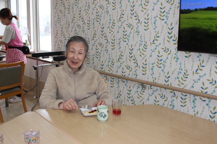 お昼寝から覚めてさっぱりされています。僕のもお一つよろしくね♪そのあとは皆さんと洗濯ばさみで手先の運動をして遊びました。フロアは、優しい童謡の音楽が流れ穏やかな時間を過ごしました。優しい職員さんと沢山お話が出来て良かったですね~♪