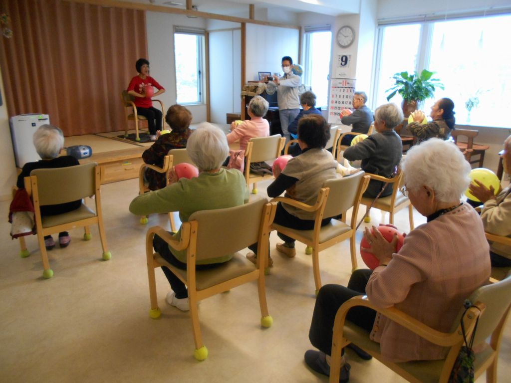 9 遅れて参加のYさん。こんなに両手が上がるとは知らなかったな~。7 6 ボールを使っての体操では、気がつけば太ももの前の方ががピクピクする位疲れてしまいます。2 バストアップにも有効だそうです。励むべし私っ!3 4 体操教室の日は各階の皆さんも参加されてにぎやかです。次はお正月太り対策で私も参加しよ~。5